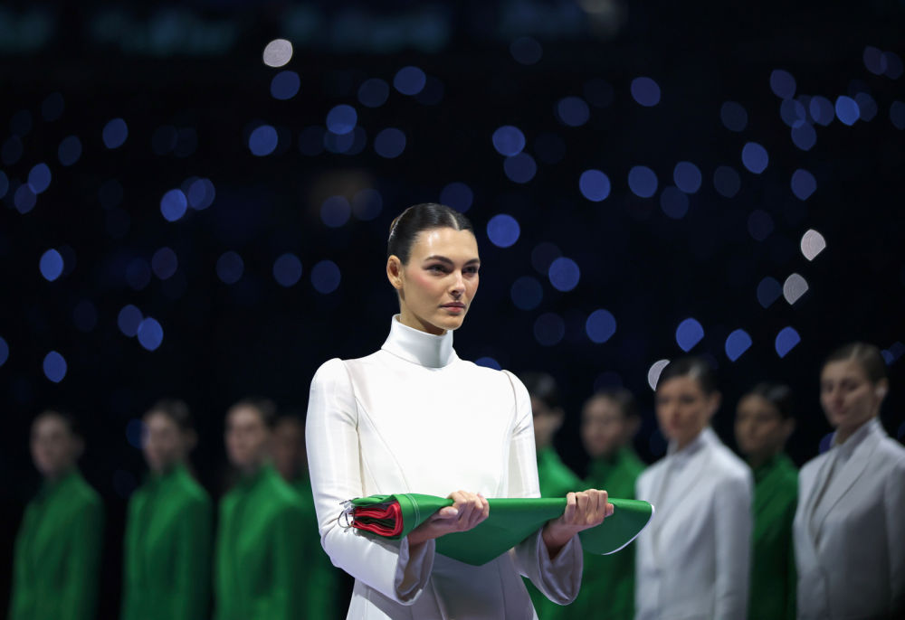 ↑执旗手护送奥林匹克会旗入场。