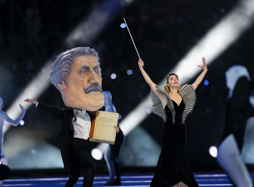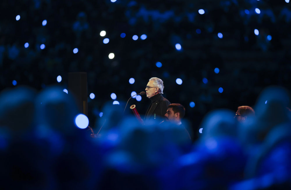 ↑意大利歌唱家安德烈·波切利在开幕式上表演。