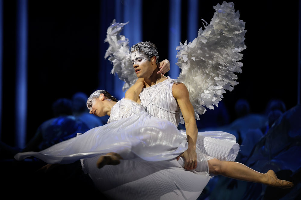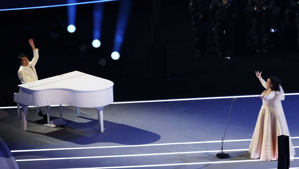 ↑中国钢琴家郎朗(左)与意大利歌唱家切奇莉亚·巴托莉合作演出。