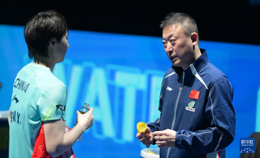 2月7日,王曼昱(左)与教练马琳在比赛间隙交流。