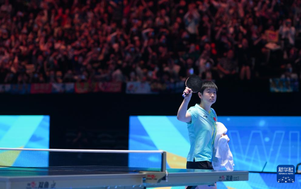 2月8日,孙颖莎在比赛结束后向观众致意。