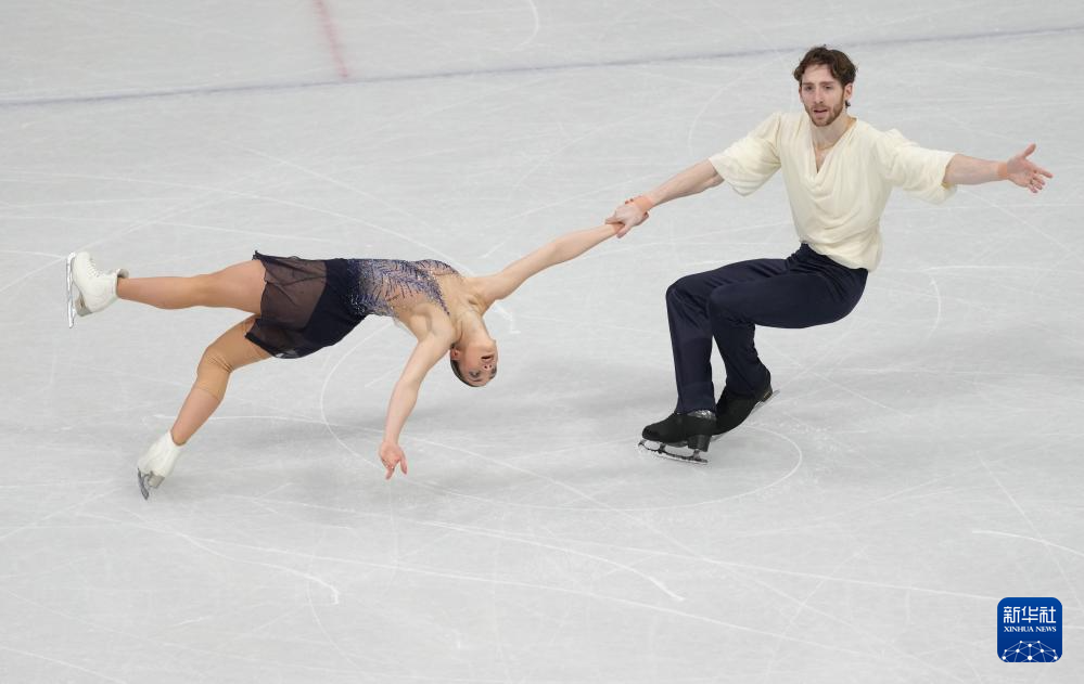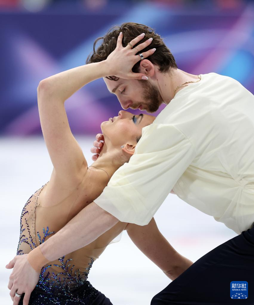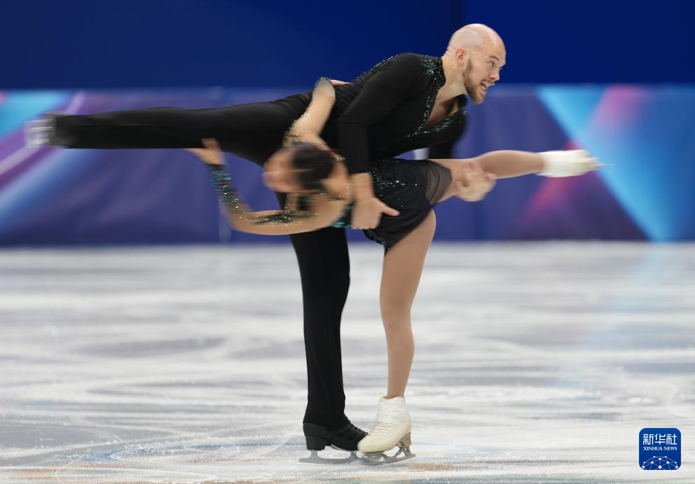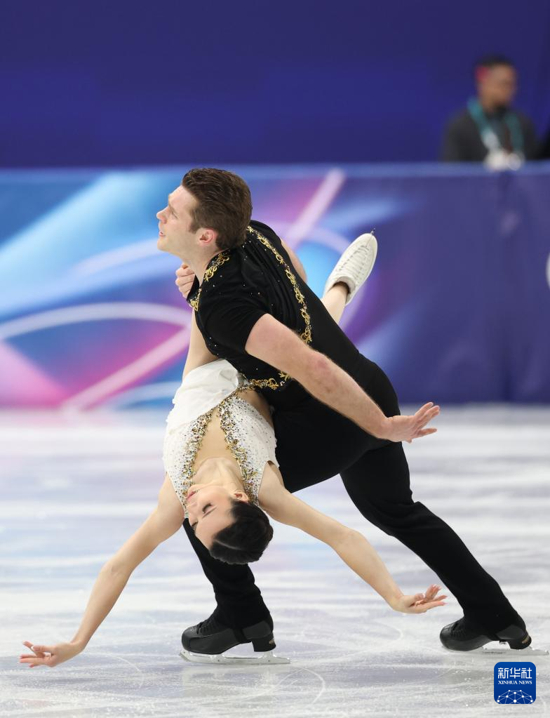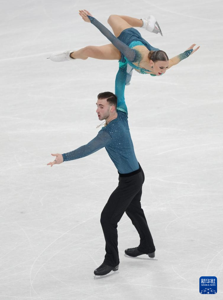 2月8日,加拿大队组合佩雷拉(左)/米肖在团体赛双人滑自由滑比赛中。