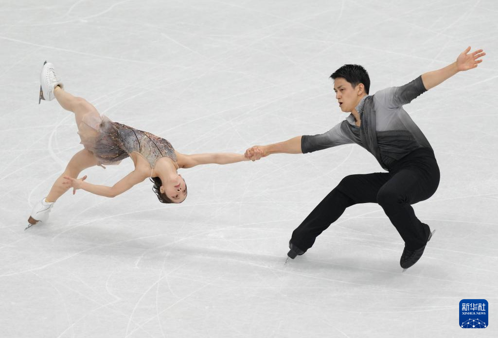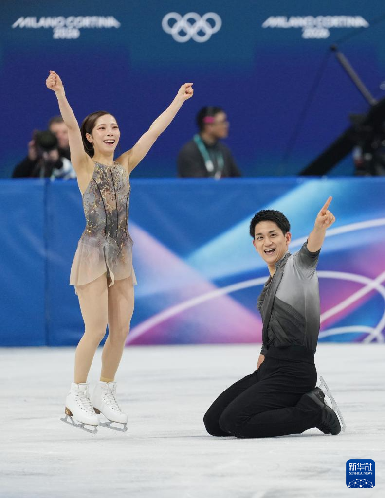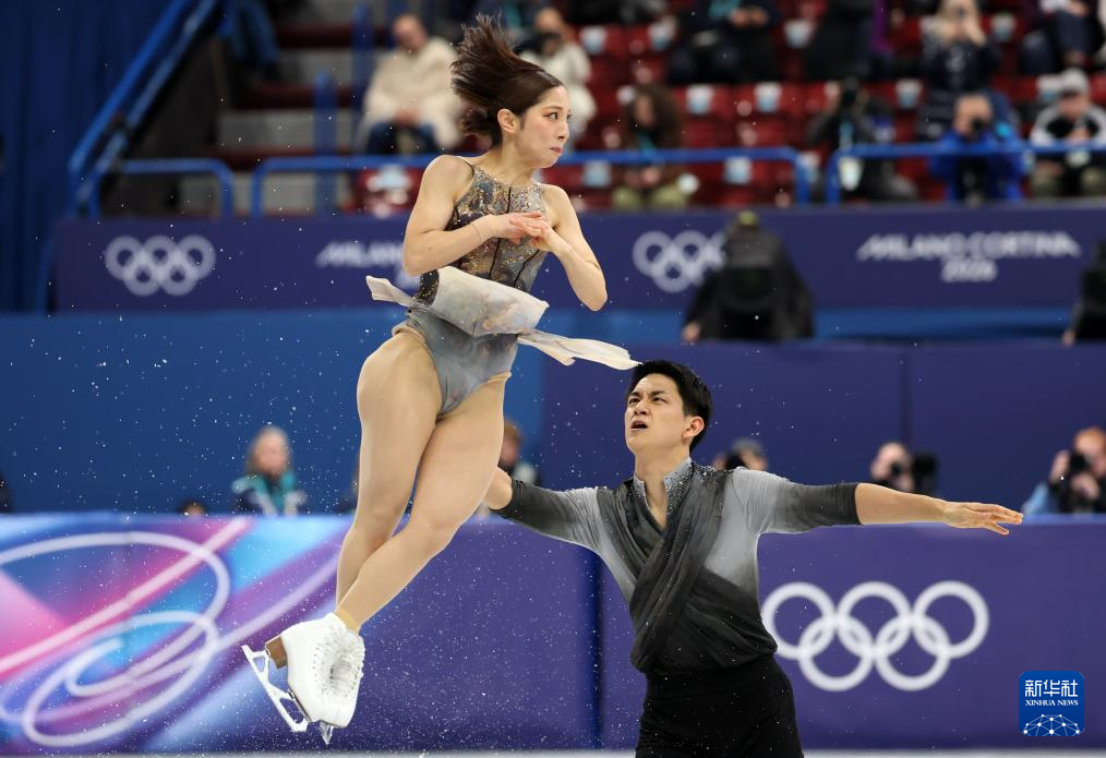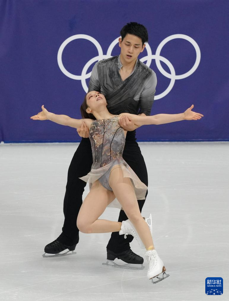 2月8日,日本队组合三浦璃来(左)/木原龙一在团体赛双人滑自由滑比赛中。
