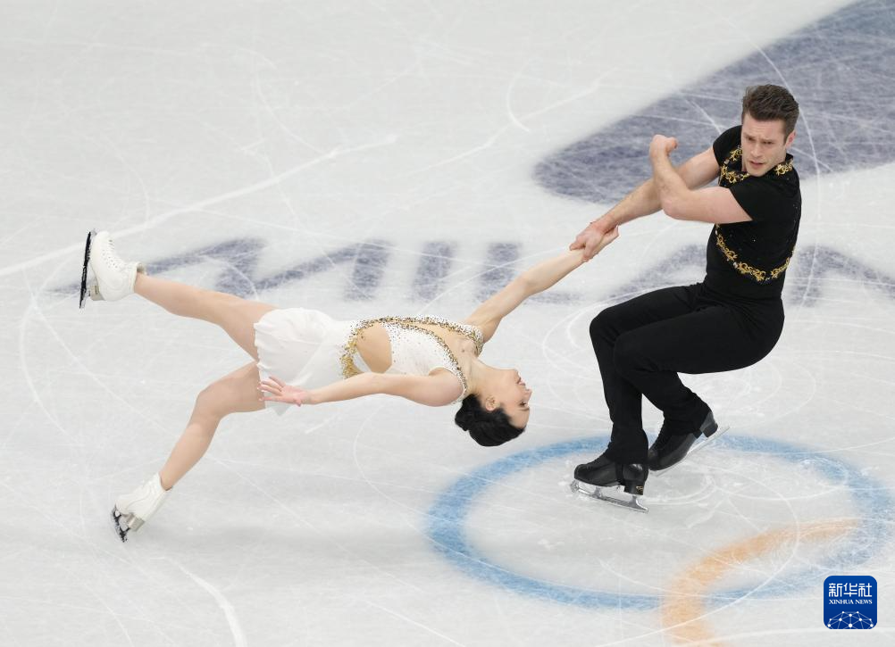 2月8日,加拿大队组合佩雷拉(前)/米肖在团体赛双人滑自由滑比赛中。