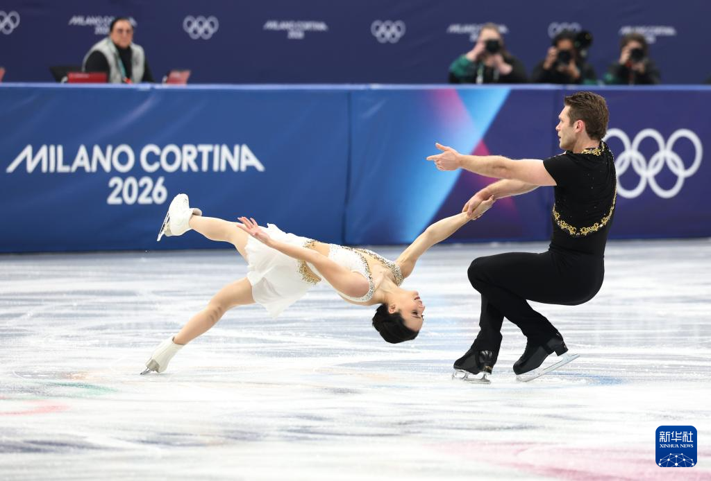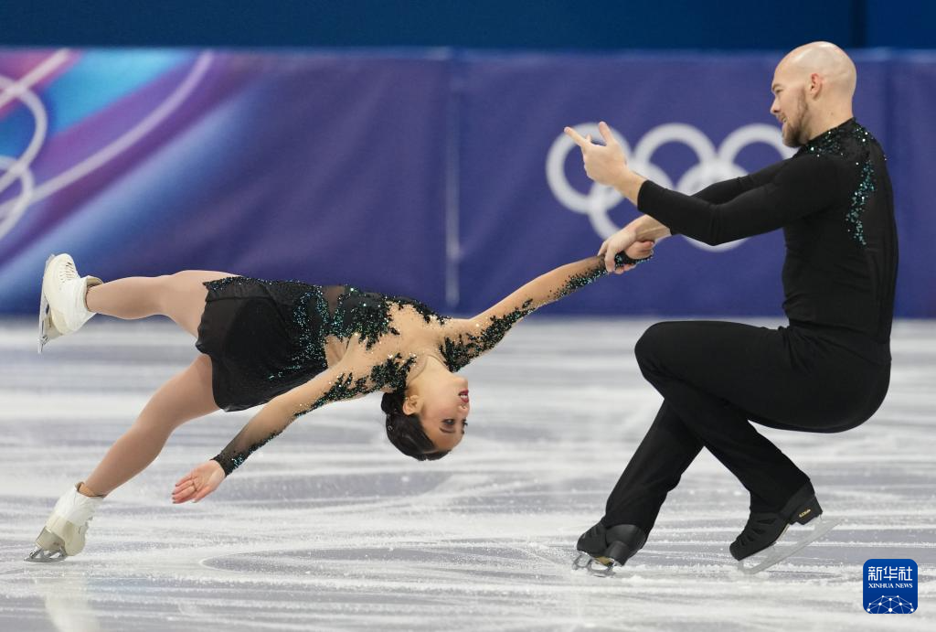 2月8日,美国队组合埃莉·甘(左)/奥谢在团体赛双人滑自由滑比赛中。