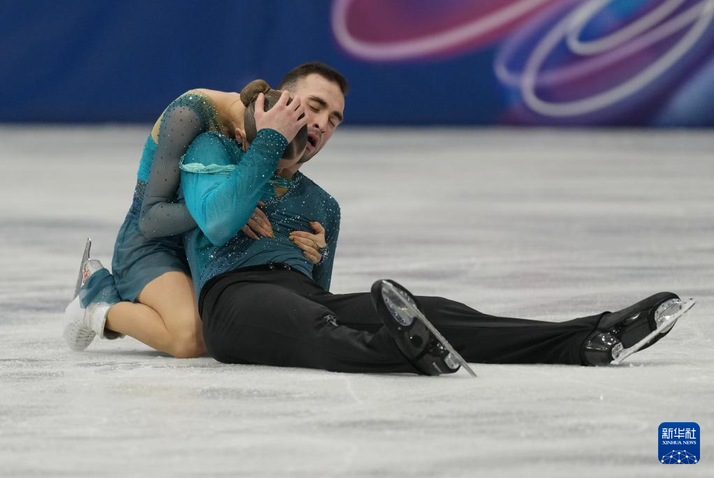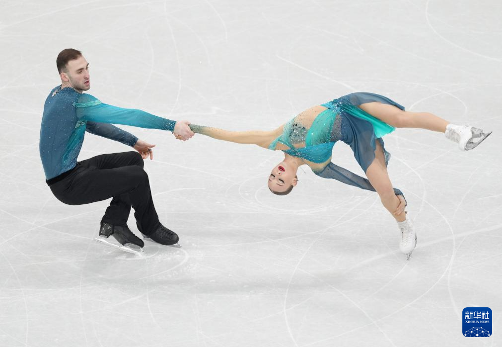 2月8日,格鲁吉亚队组合阿纳斯塔西娅·梅特尔基娜(右)/卢卡·别鲁拉瓦在团体赛双人滑自由滑比赛中。