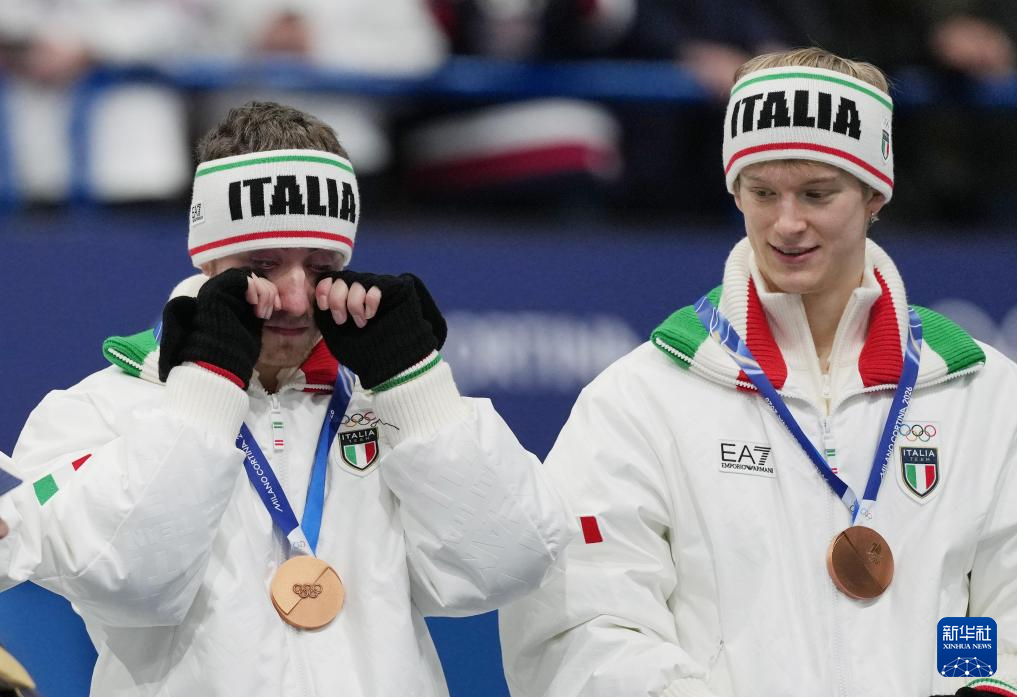 2月8日,意大利队选手里佐(左)在颁奖仪式上落泪。