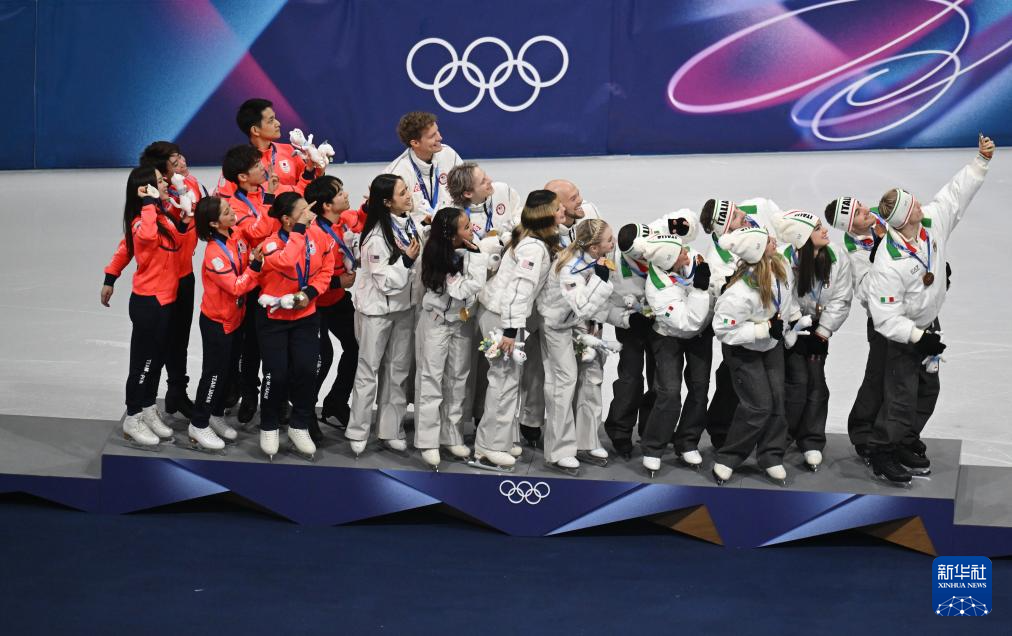 2月8日,意大利队在颁奖仪式后合影。