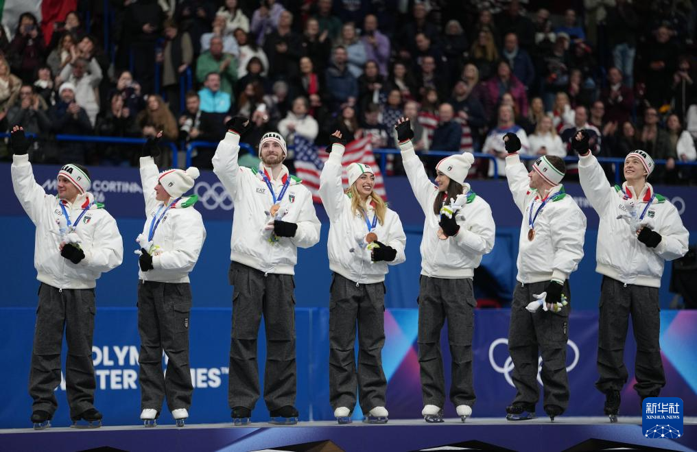 2月8日,意大利队在颁奖仪式上庆祝。
