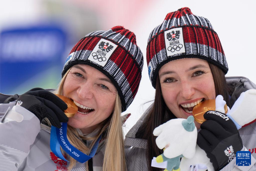 2月10日,冠军奥地利2队组合雷德勒(左)/胡贝尔在比赛后庆祝。