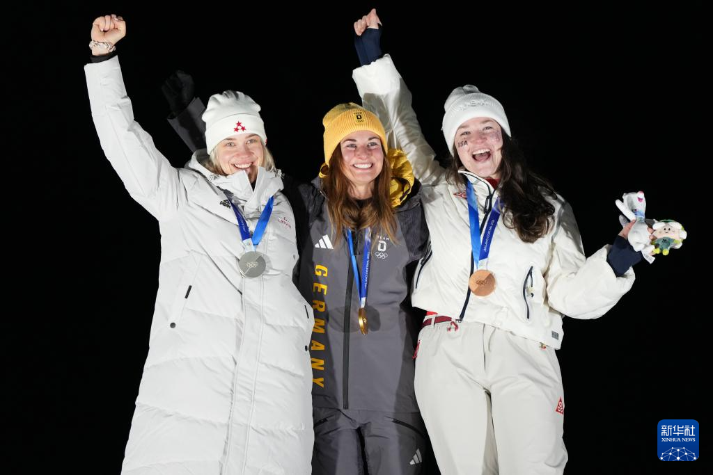 2月10日,冠军德国选手陶比茨(中),亚军拉脱维亚选手博塔(左),季军美国选手阿什莉·法夸尔森在颁奖仪式上合影。