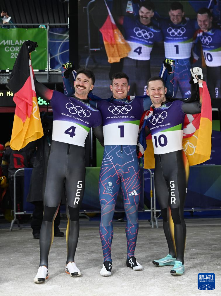 2月13日,冠军英国选手韦斯顿(中)、亚军德国选手容克(左)和季军德国选手格罗特赫尔在颁奖仪式上合影。