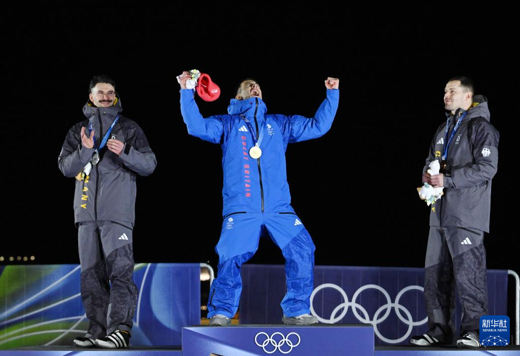 2月13日,冠军英国选手韦斯顿在颁奖仪式上庆祝。