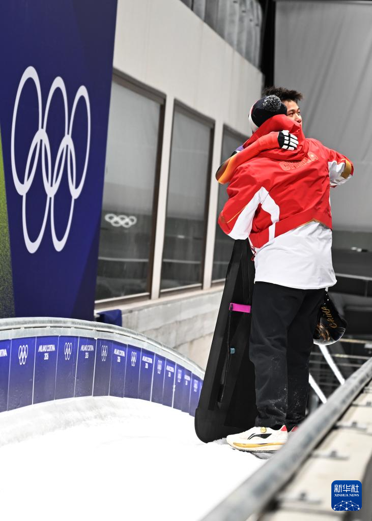 2月13日,中国选手陈文浩(前)在第四轮比赛后与队友拥抱庆祝。他获得第四名。