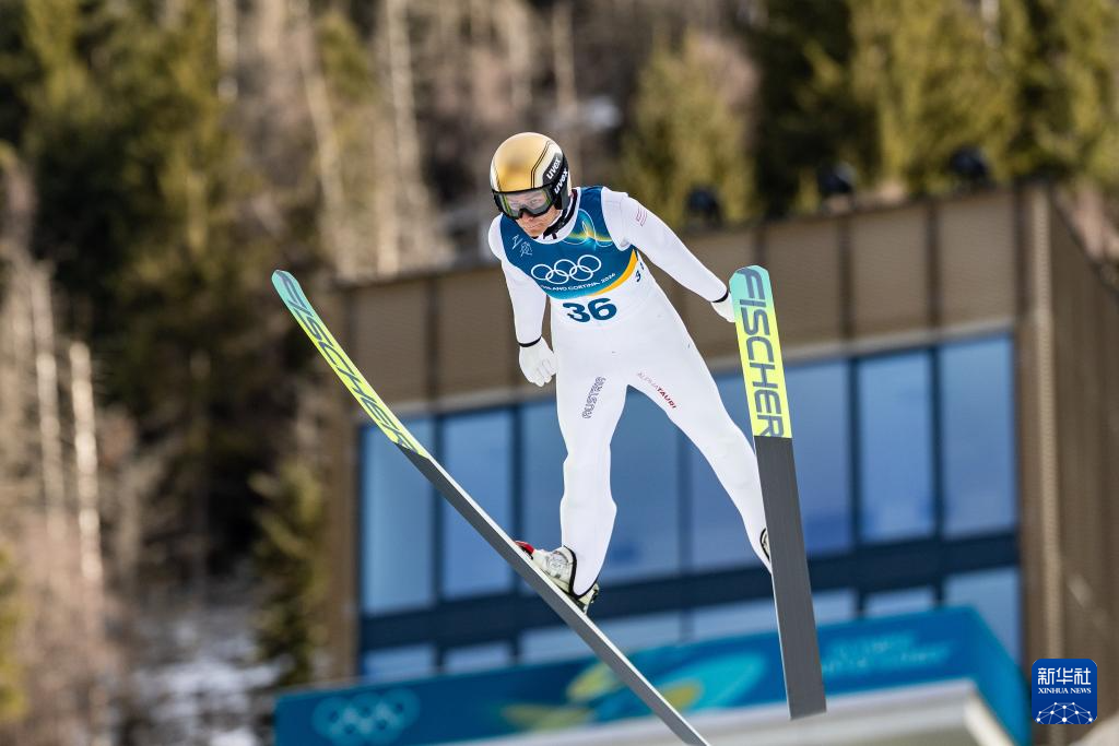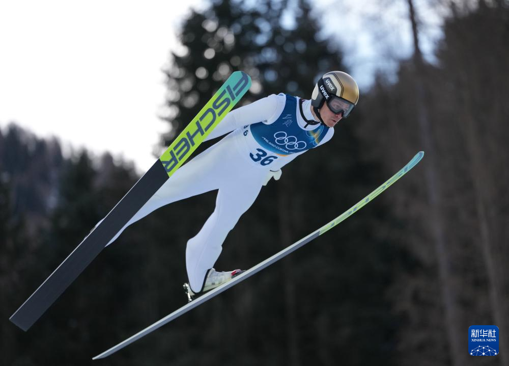 2月17日,奥地利选手兰帕特尔在个人大跳台比赛轮中。