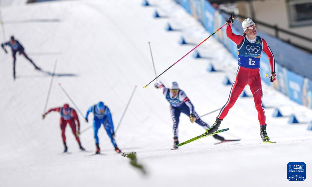 2月18日,挪威队选手克莱博在比赛冲线时庆祝。