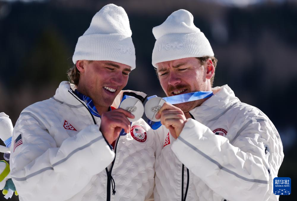 2月18日,亚军美国队选手奥格登(右)、舒马赫在颁奖仪式上。