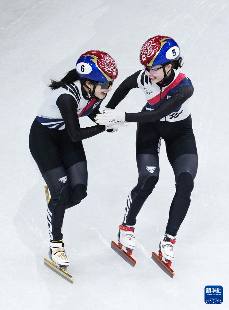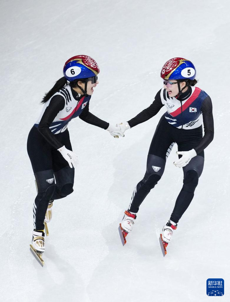 2月18日,韩国队选手金吉莉(右)率先撞线后庆祝。