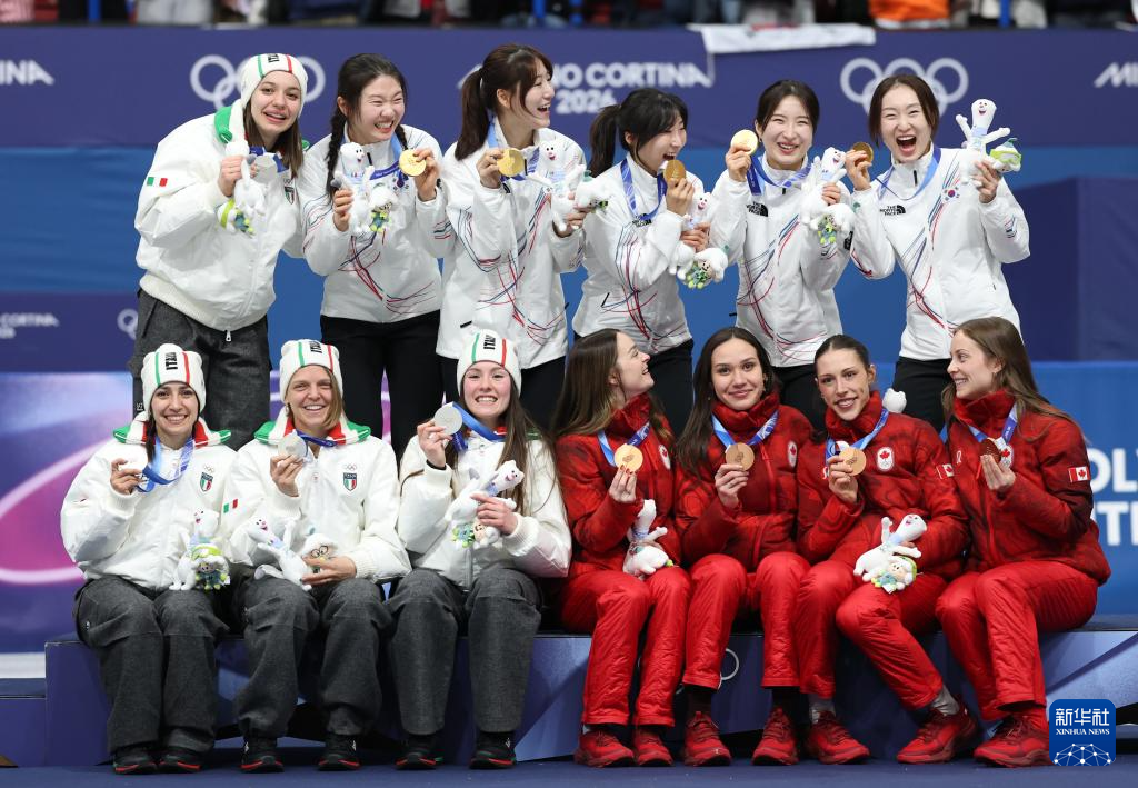 2月18日,冠军韩国队(上)、亚军意大利队(左下)和季军加拿大队在颁奖仪式上。