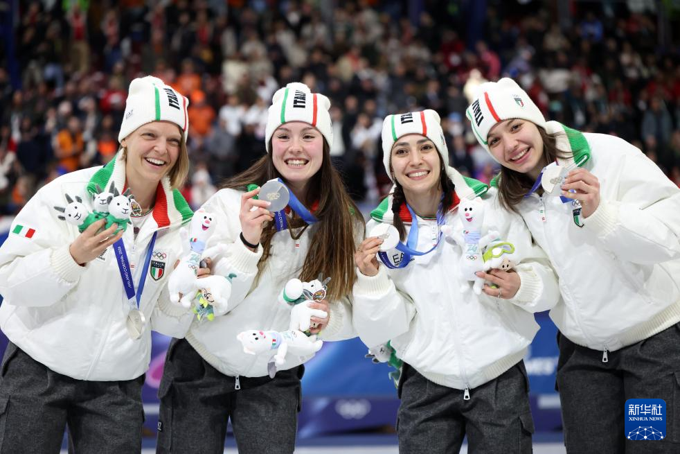2月18日,亚军意大利队选手在颁奖仪式上。