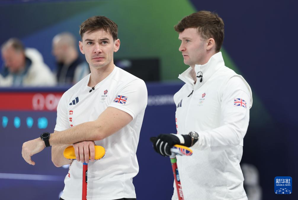 2月18日,英国队选手哈迪(左)和莫阿特在对阵美国队的比赛中。英国队9比2战胜美国队。