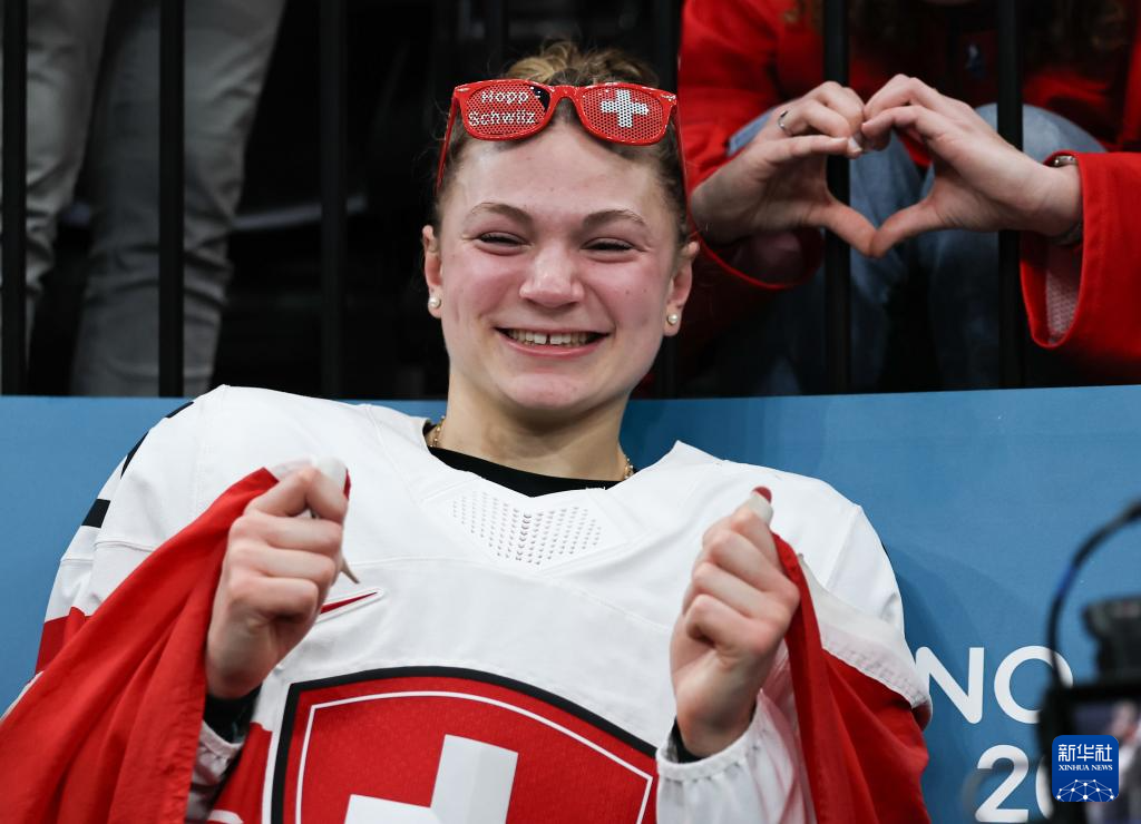 2月19日,瑞士队球员阿林娜·米勒在赛后庆祝胜利。
