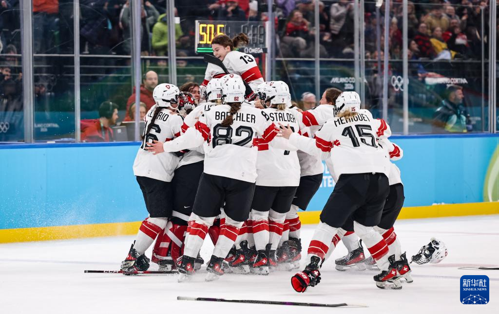 2月19日,瑞士队球员阿林娜·米勒(中)在加时赛中攻入制胜球后庆祝。