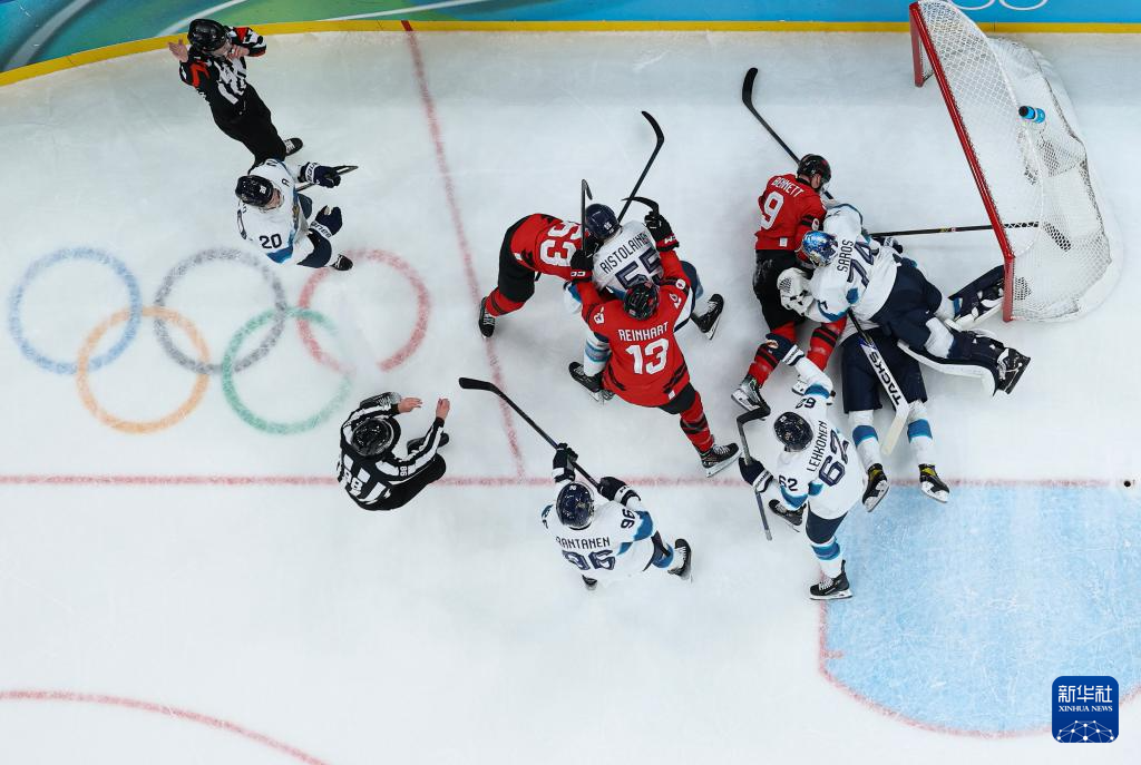 2月20日,芬兰队球员欣茨(右)和加拿大队球员麦金农(左二)在比赛中拼抢。