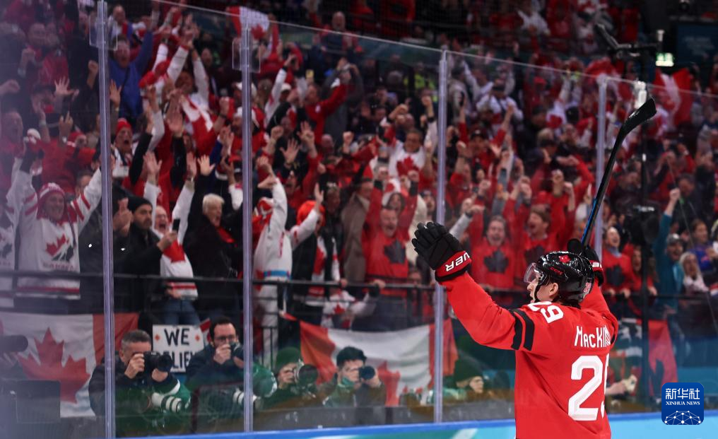 2月20日,加拿大队球员麦金农在比赛中庆祝打出制胜球。