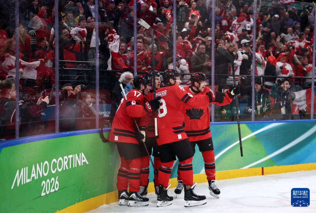 2月20日,加拿大队球员在比赛中庆祝进球。