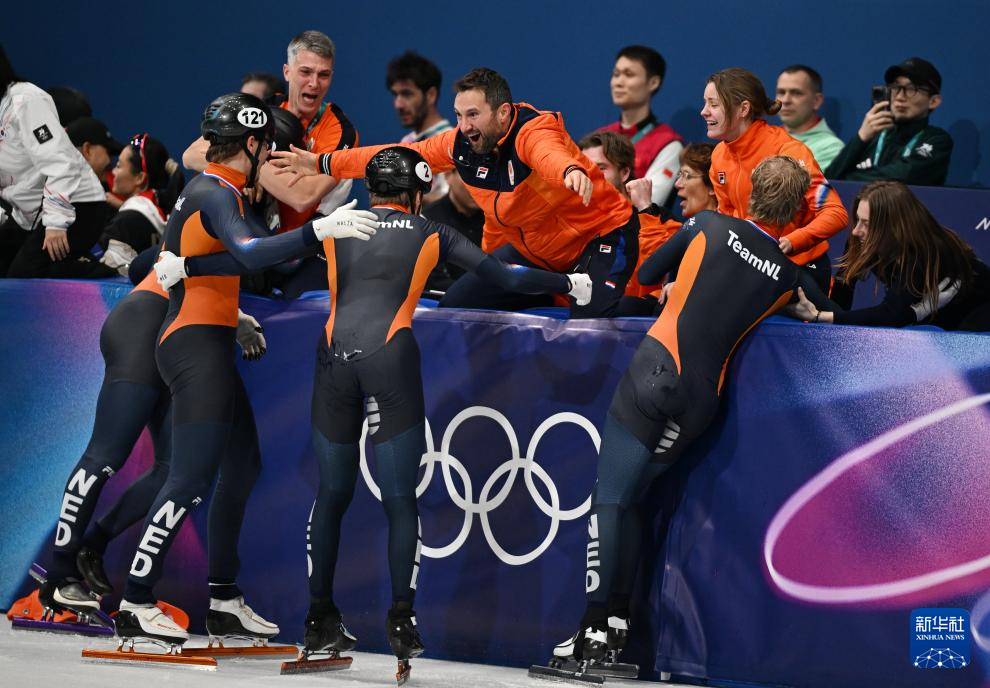 2月20日,荷兰队选手滕·布尔(前)与队友弗里索·埃蒙斯(中排左一)在比赛中交接棒。