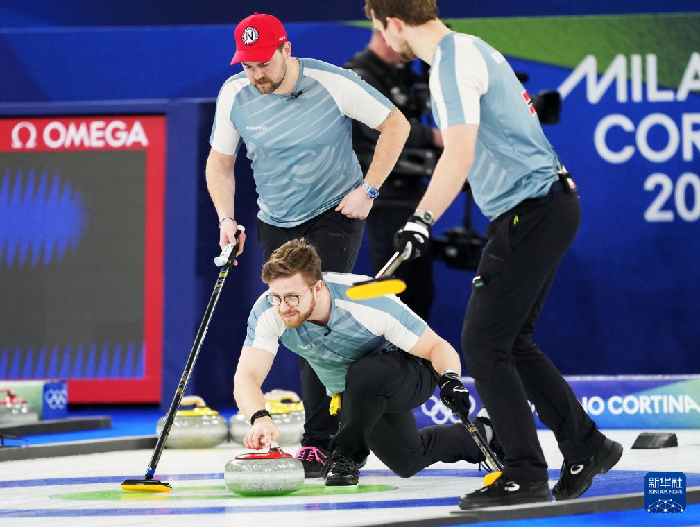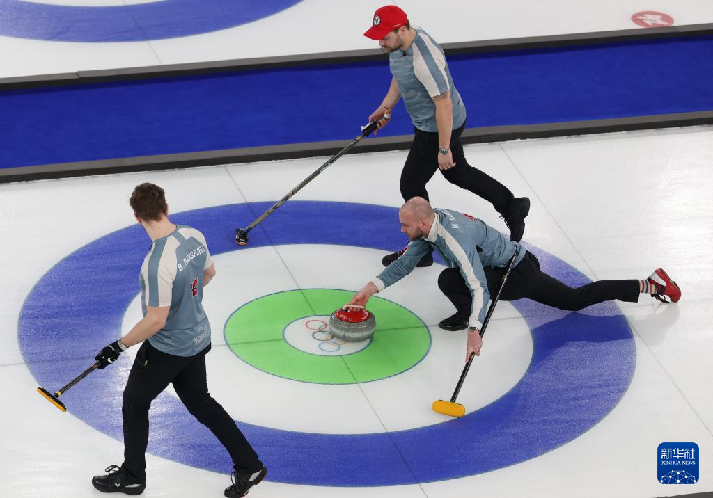 2月20日,挪威队选手塞萨克(中)在比赛中掷壶。