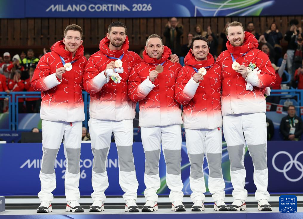 2月21日,冠军加拿大队(中)、亚军英国队(左)和季军瑞士队在颁奖仪式上合影。