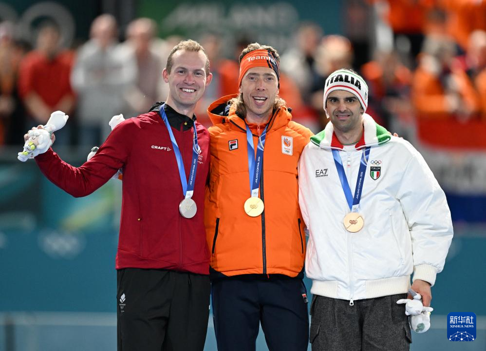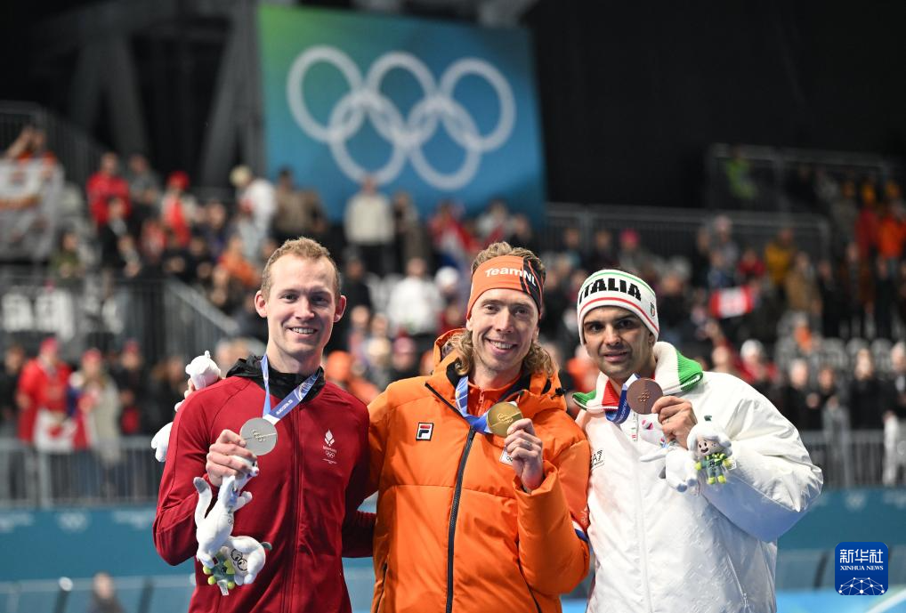 2月21日,冠军荷兰选手伯格斯马(中)、亚军丹麦选手托鲁普(左)和季军意大利选手焦万尼尼在颁奖仪式上。