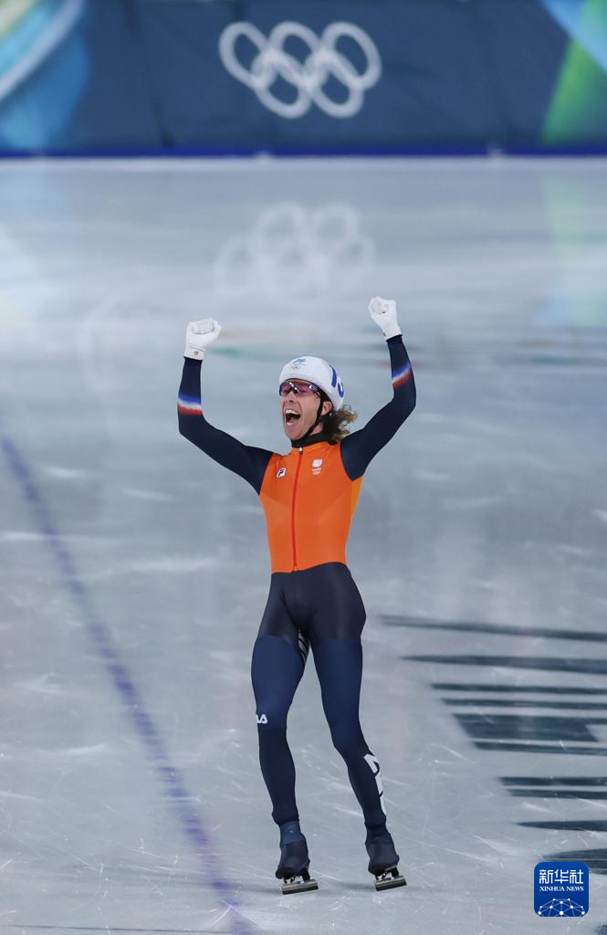 2月21日,冠军荷兰选手伯格斯马在冲过终点线前庆祝。