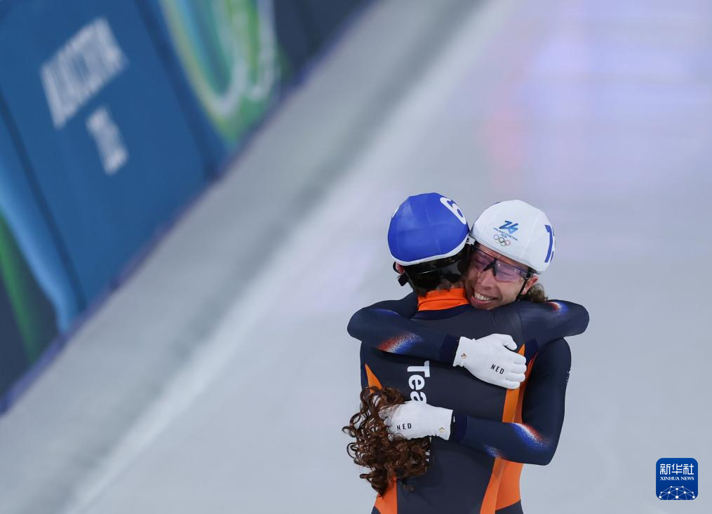 2月21日,冠军荷兰选手伯格斯马(右)在比赛后与队友范德邦特拥抱庆祝。