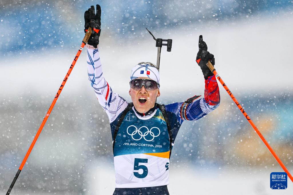 2月21日,军法国选手米舍隆夺冠后庆祝。