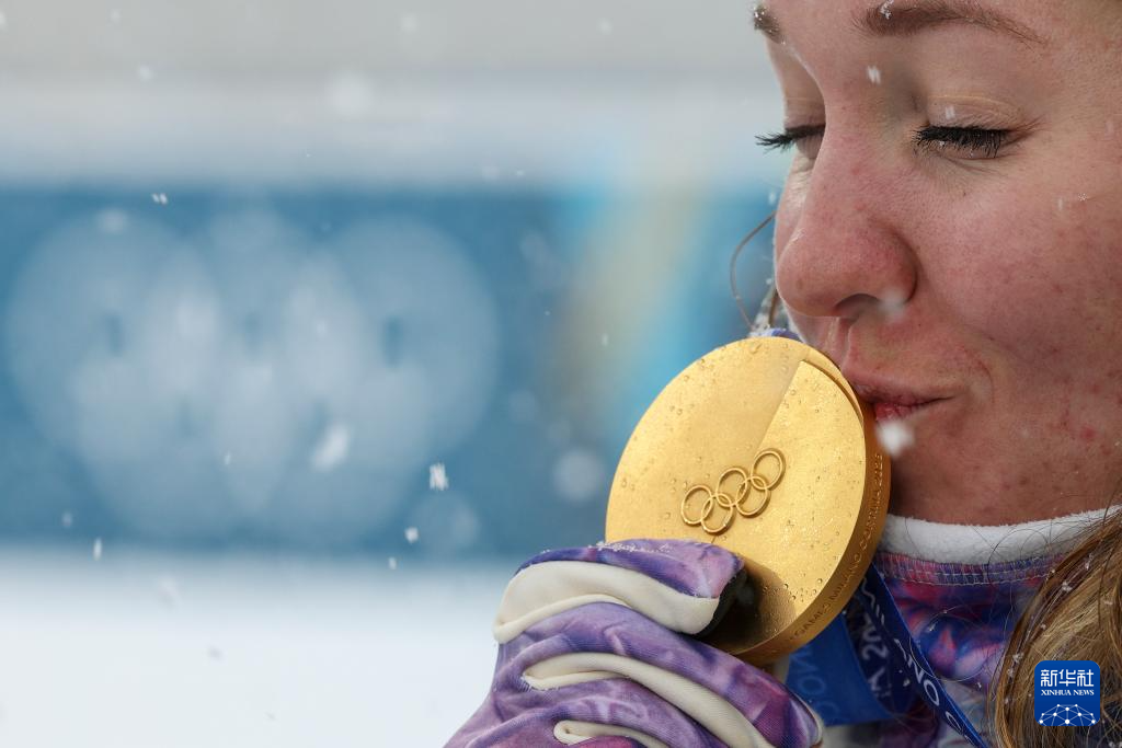 2月21日,冠军法国选手米舍隆在颁奖仪式后亲吻金牌。