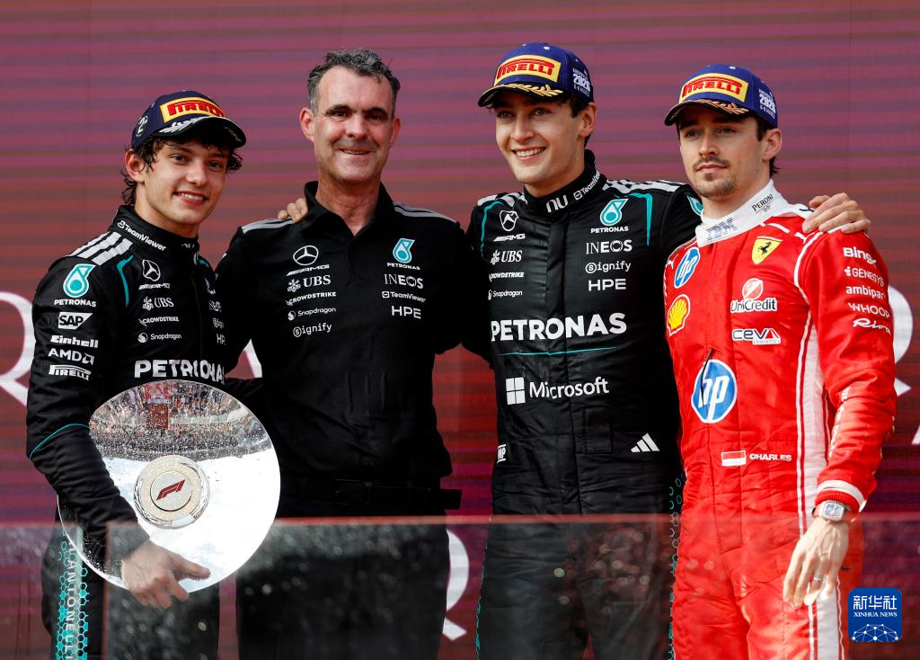 3月8日,冠军梅赛德斯车队英国车手拉塞尔(中)、亚军梅赛德斯车队意大利车手安东内利(左)和季军法拉利车队摩纳哥车手勒克莱尔在颁奖典礼上开香槟庆祝。