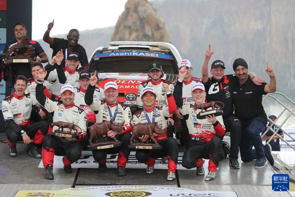 3月15日,获得冠军的丰田车队车手胜田贵元(前,右二)和领航员约翰斯顿(前,左二)在颁奖仪式后与车队成员合影。