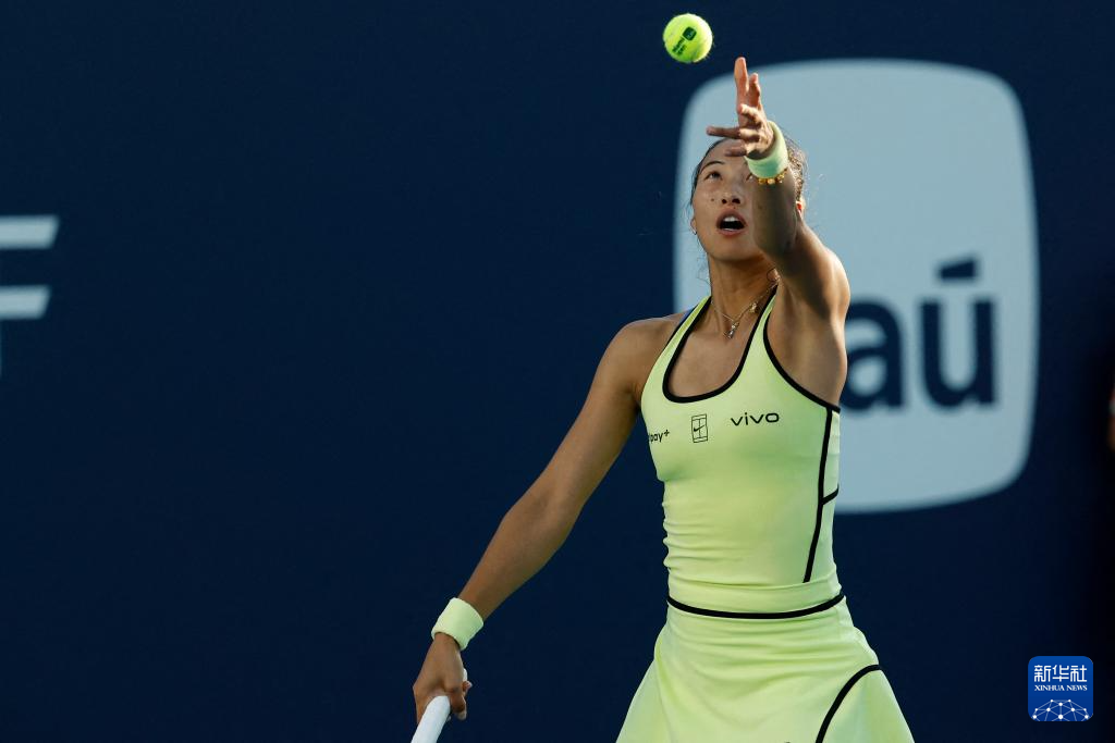 3月22日,郑钦文在比赛中发球。