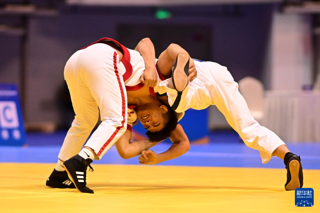 3月24日,新疆队选手阿格坚·胡安西(左)与四川体育职业学院队选手乃古吉惹在男子56公斤级半决赛中。最终,阿格坚·胡安西战胜乃古吉惹,晋级决赛。