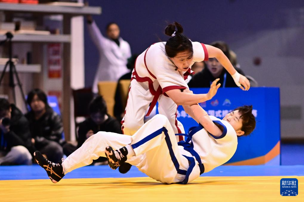 3月24日,黑龙江省队选手高宇飞(上)与首都体育学院队选手丁艺在女子60公斤级决赛中。最终,高宇飞战胜丁艺,夺得冠军。
