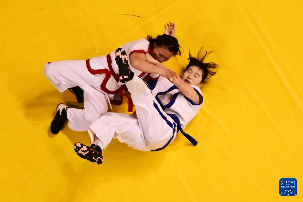 3月24日,首都体育学院队选手丁艺(右)与江西师范大学科学技术学院体育学院队选手仲前程在女子60公斤级半决赛中。最终,丁艺战胜仲前程,晋级决赛。