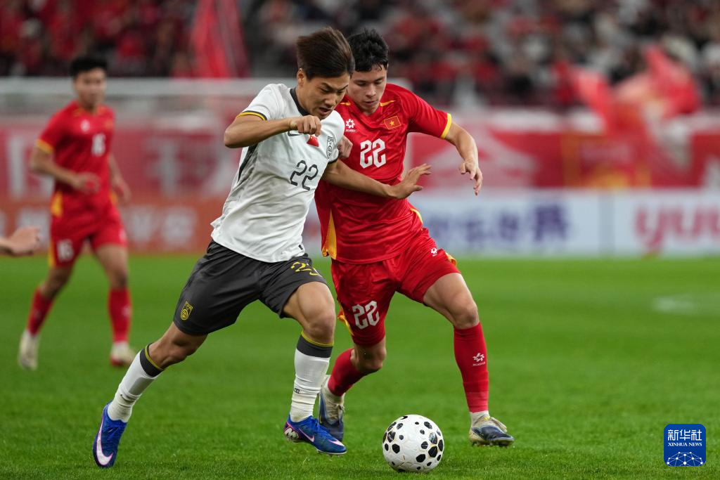 3月31日,越南队球员黎胜龙(左)和中国队球员玄智健在比赛中拼抢。