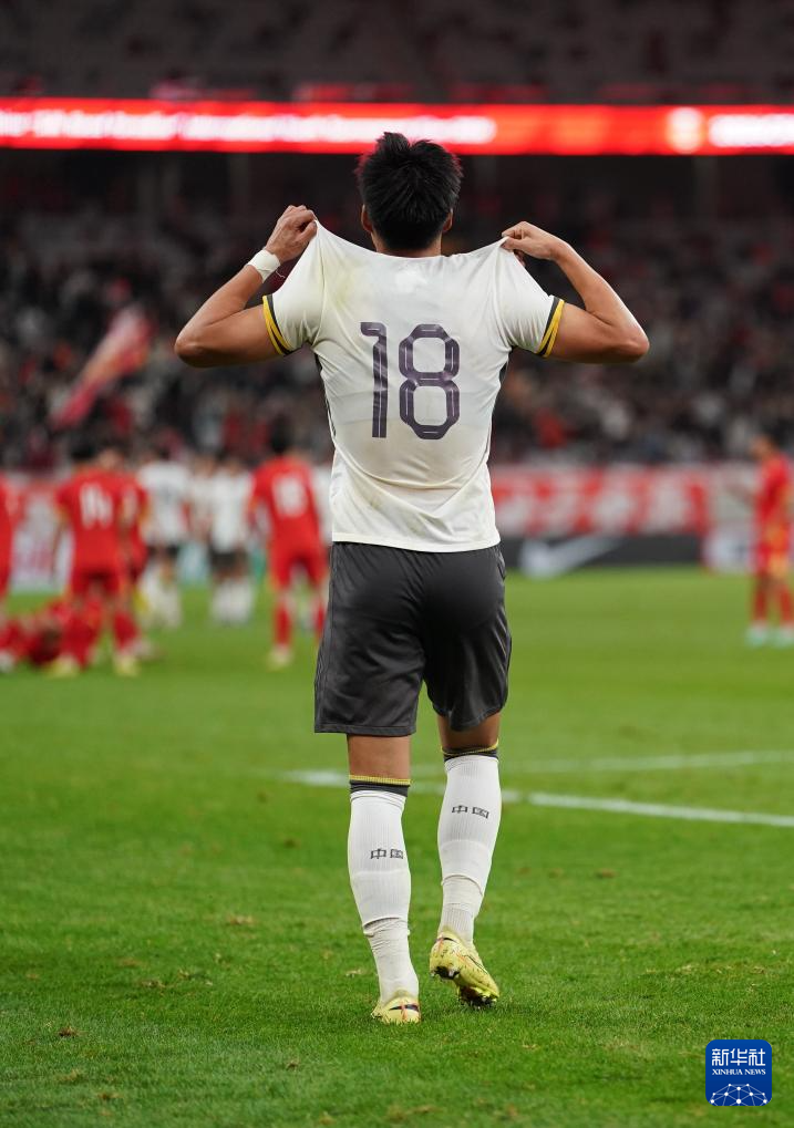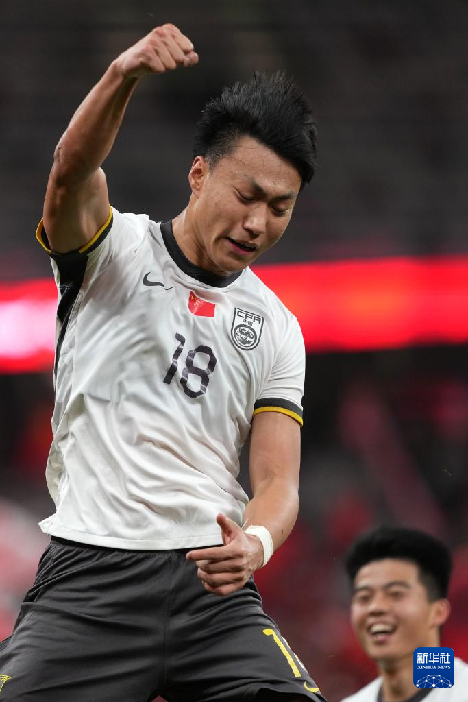 3月31日,中国队18号球员杜月徵(前)庆祝进球。