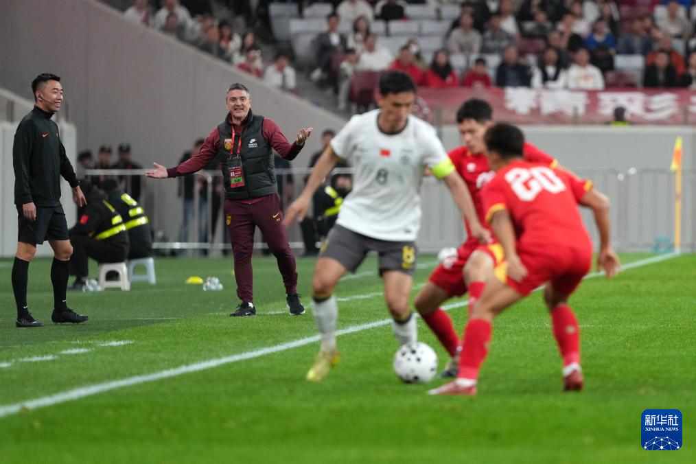 3月31日,中国队主教练安东尼奥·普切(左二)在比赛中与裁判交流。