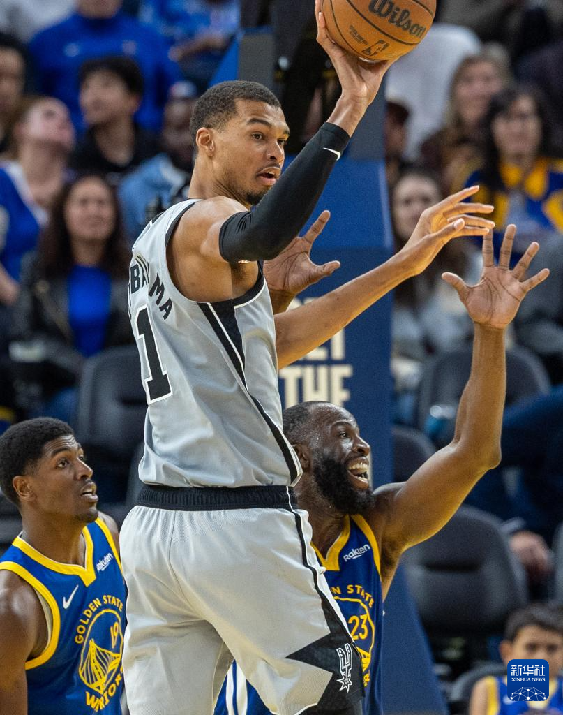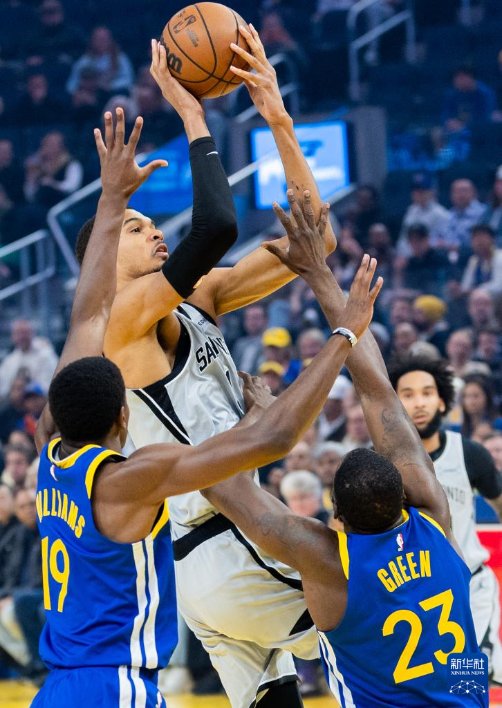 4月1日,马刺队球员文班亚马(中)在比赛中投篮。