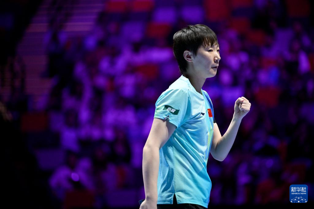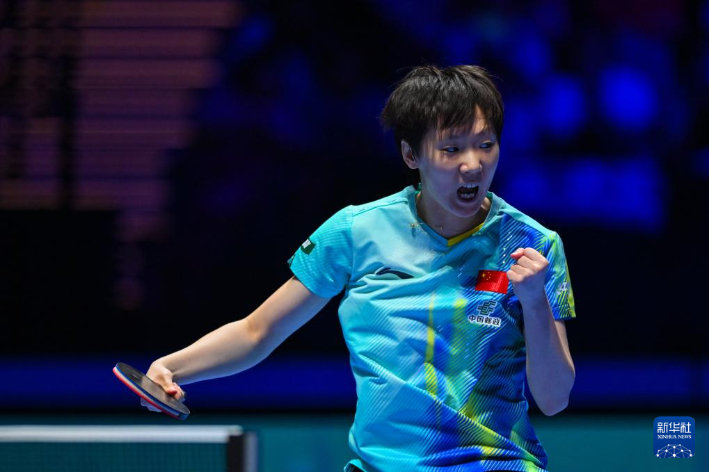 4月2日,中国选手王曼昱在比赛中庆祝得分。