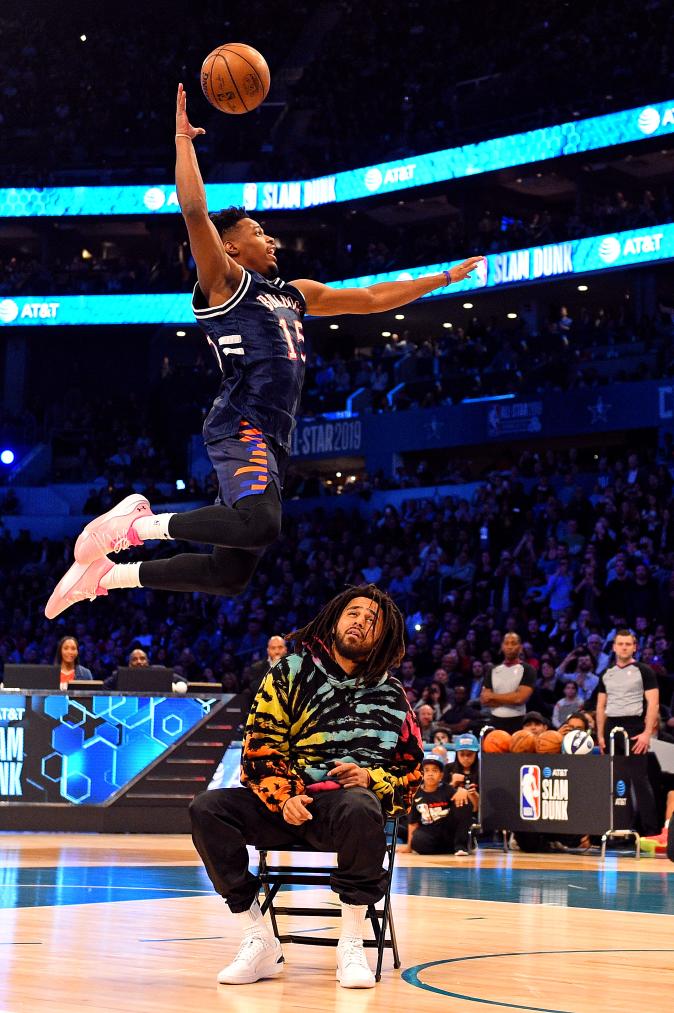 资料图:2019年美职篮(NBA)全明星周末上,J.Cole作为嘉宾参与扣篮大赛